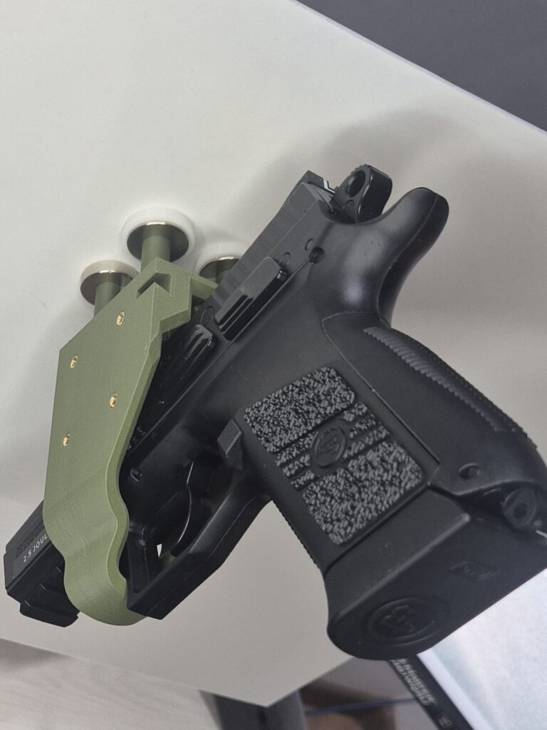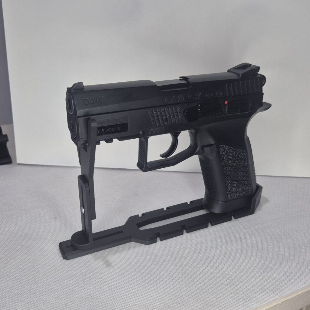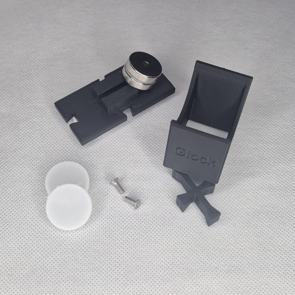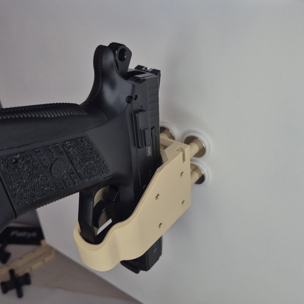 Modułowy uchwyt M1 mocowany na magnesy lub śruby. Uchwyt wyposażony jest w dystans DX który daje nam w zależności od sposobu montażu, miejsce na kolimator oraz wygodny chwyt broni w przypadku mocowania bocznego do ściany, jeżeli magnesy są zbędne można wkręcić dystans DX bez magnesów i przykręcić uchwyt śrubami. Dystans mini DM 10 jest zaprojektowany by można było łączyć ze sobą uchwyty i ustawiać je rzędami w konfiguracji np. dwóch broni M1=DM=M1 szerokość całkowita to maksymalnie 129.85mm ( po to by przy obliczaniu miejsca liczyć 130mm ) reszta wymiarów jest uzależniona od wymiarów broni. Maksymalny udźwig 1.8kg.