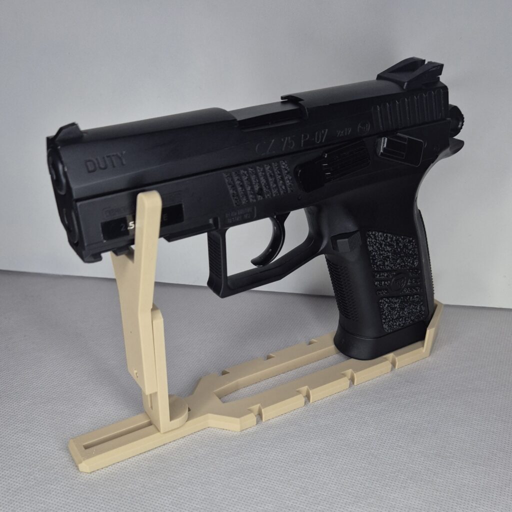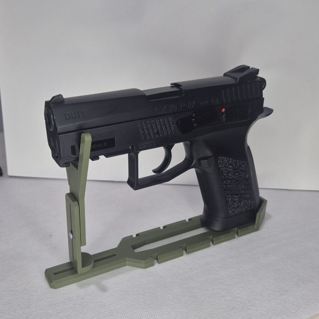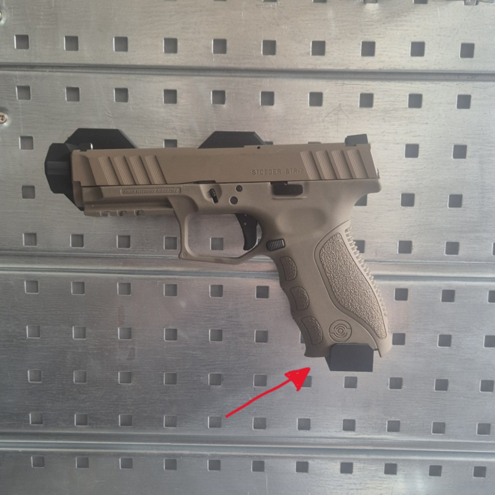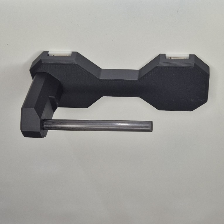 Modułowy uchwyt M1 mocowany na magnesy lub śruby. Uchwyt wyposażony jest w dystans DX który daje nam w zależności od sposobu montażu, miejsce na kolimator oraz wygodny chwyt broni w przypadku mocowania bocznego do ściany, jeżeli magnesy są zbędne można wkręcić dystans DX bez magnesów i przykręcić uchwyt śrubami. Dystans mini DM 10 jest zaprojektowany by można było łączyć ze sobą uchwyty i ustawiać je rzędami w konfiguracji np. dwóch broni M1=DM=M1 szerokość całkowita to maksymalnie 129.85mm ( po to by przy obliczaniu miejsca liczyć 130mm ) reszta wymiarów jest uzależniona od wymiarów broni. Maksymalny udźwig 1.8kg.