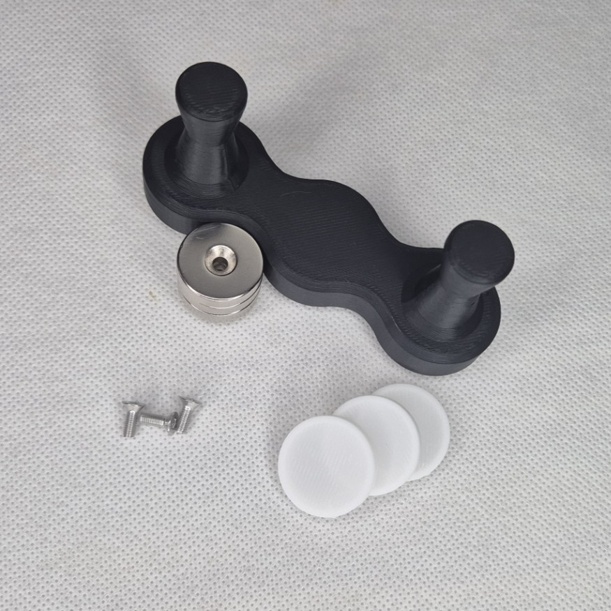 Podkładka drukowana z TPU zapobiega rysowaniu szafy przez magnesy przy czym dodatkowo zwiększa tarcie między magnesami, a ściana tak by zniwelować efekt zjeżdżania uchwytu. Brak możliwości doboru koloru.
