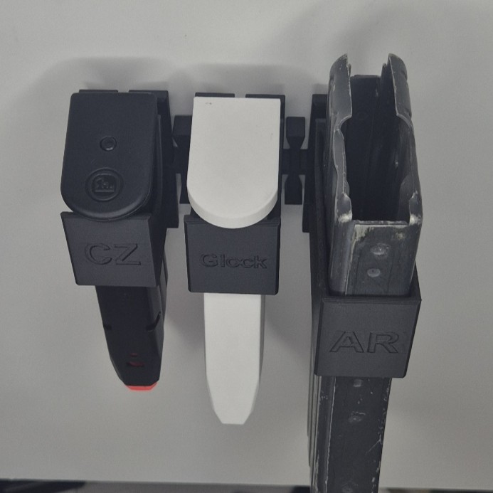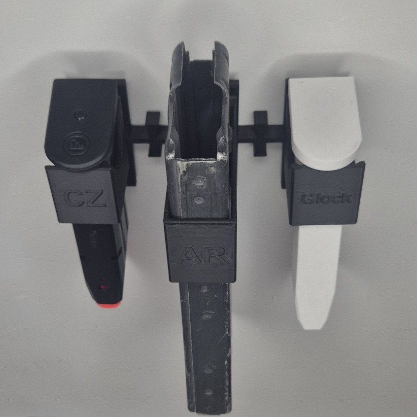 Uchwyty na magazynki magnetyczne, uchwyty można między sobą łączyć na 2 sposoby tak by jak najwięcej ich pomieścić lub wygodnie wyciągać z uchwytu. Kolorystyka standardowa Czarny, Ciemna zieleń i Pustynny. Na ostatnim zdjęciu widać zawartość jednego zestawu.